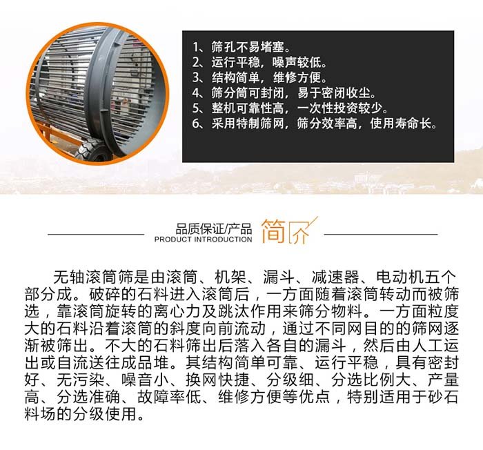 無(wú)軸滾筒篩也叫做滾筒篩沙機(jī)、滾筒篩,是我公司為電廠、焦化廠、建材、冶金、化工、礦山等行業(yè)而研制的專用篩分設(shè)備,它克服了各種振動(dòng)篩在篩分較濕物料時(shí)出現(xiàn)的篩網(wǎng)粘堵問(wèn)題,提高了篩分系統(tǒng)的產(chǎn)量和可靠性。適宜篩分各種性質(zhì)的物料,以及煤、煤矸石、焦炭生熟石灰等潮濕易堵塞物料,篩下產(chǎn)品大100mm,中間10-50mm,細(xì)可達(dá)3mm以下,該產(chǎn)品深受廣大用戶的一致好評(píng)。
